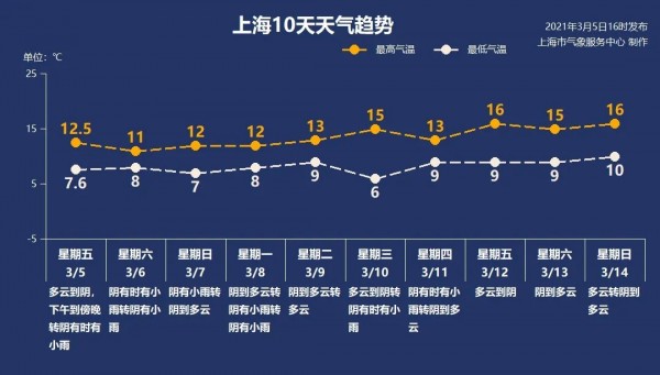 今晨弱冷空气抵沪,全天气温走低,阴有时有小雨。晚间雨势增强,直到明日下午雨水渐止,转为阴到多云。