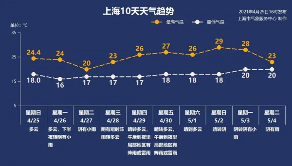上海天气:16-24℃,多云,半夜前后转阴有阵雨