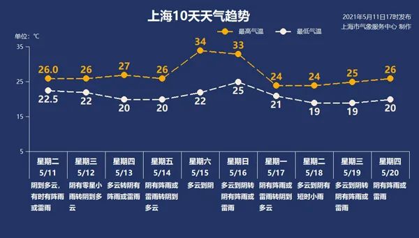 未来一段时间,上海在阴和雨之间来回切换,雷阵雨天气较多。近三天气温较平稳,在20~27℃之间。双休日雨水间歇,气温再度飙升,最高在33~34℃之间。